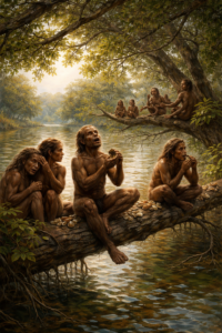 What does require explanation is why we have so much vocal control in the first place. Human speech uses only a fraction of our available pitch, rhythm and timing capacity. The surplus is overwhelmingly musical and social. We sing, chant, soothe infants, coordinate groups and vocalise for reasons that have nothing to do with propositional content. Song and rhythmic vocal play are far more plausible early uses of fine breath control than fully fledged language. They tolerate imprecision, work in low visibility, scale easily to groups and bind individuals emotionally. It is not difficult to imagine proto-humans sitting on branches over a lake, eating, grooming and singing, their voices carrying across the water long before anything we would recognise as language appears.