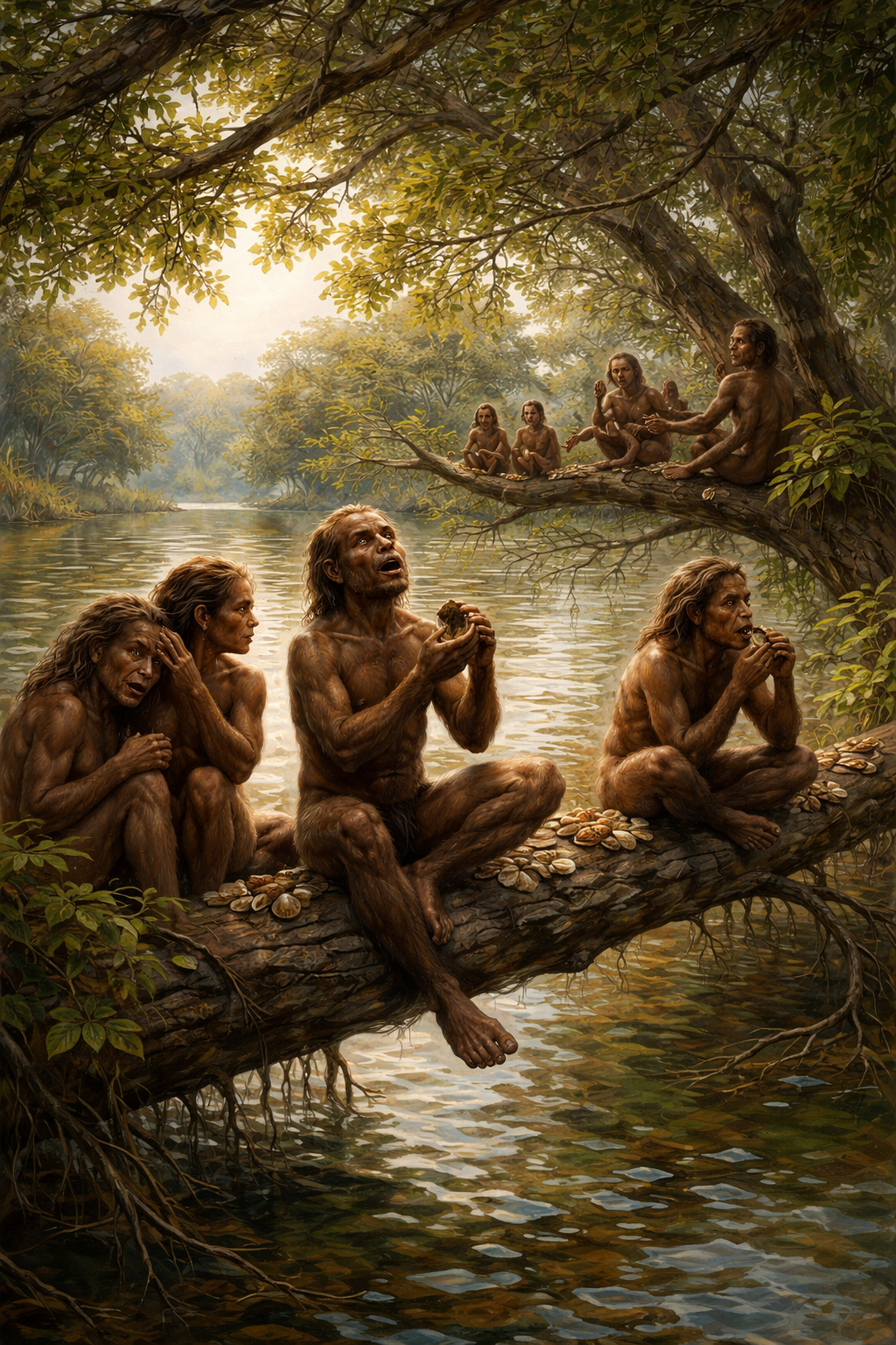 Seen from this angle, bipedalism also loses much of its mystique. Standing upright on an open plain is dangerous. Standing upright in shallow water is immediately useful. It keeps the head dry, frees the hands, allows one to see over reeds, and makes carrying infants or food straightforward. Wading does not require heroic reinterpretations of anatomy. It merely requires an ape whose familiar forest floor has become intermittently submerged.